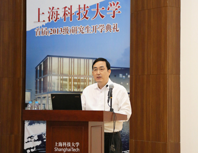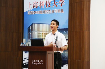 在研究生代表发言环节,物质学院新生姜明超表达了自己作为上科大第一批学生的庆幸与自豪,以及自己对上科大“改革创新”、“以人为本”办学理念和“小规模、高水平、国际化”办学特色的理解和认同。他倡议同学们肩负起上科大首届研究生的历史责任和使命,坚定立志报国的决心,发扬吃苦耐劳的精神,潜心科研,锐意创新,向国家、向社会交出一份令人满意的答卷。