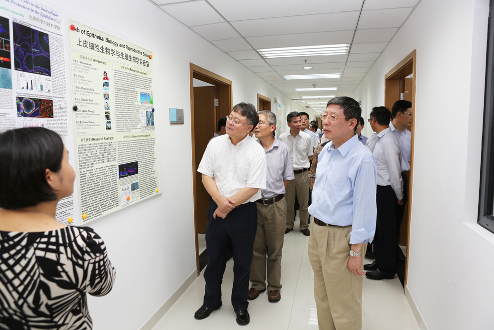 杨雄一行首先考察了校园建设工地和两栋已通过验收的本科生宿舍楼,上科大首届208名本科生和部分研究生将于9月底入住这里。随后,杨雄一行来到位于海科路100号的教学区,视察了科研楼4楼物质学院和3楼生命学院的实验室,并与在场的上科大新聘教授和科研人员亲切交谈。