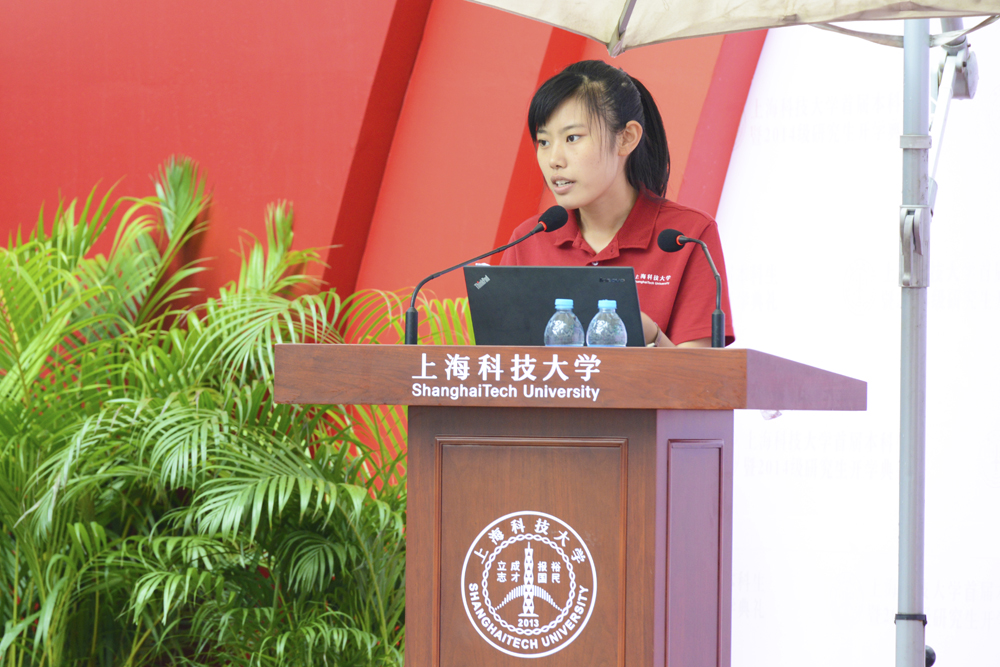 2014年,上科大采取“综合评价、择优录取、多元选择”的创新模式,面向全国9省市招收了首届207名本科生。在开学典礼上,物质科学与技术学院院长杨培东、生命科学与技术学院院长林海帆、信息科学与技术学院院长王雪红分别宣读了学院本科生名单,他们身后的大屏幕上同步展示由学生自己制作的个人介绍,使在座师生员工和来宾真切感受到首届本科生的个性、朝气和热情。随后,生命学院王俏琦同学代表首届本科生发言,她与同学们共勉:在大学期间注重锻炼独立、创新、创意思维,努力“读老师”、“读同学”、“读好书”,培养高度的社会责任感,力争在未来成为中华民族伟大复兴的领军人才。
