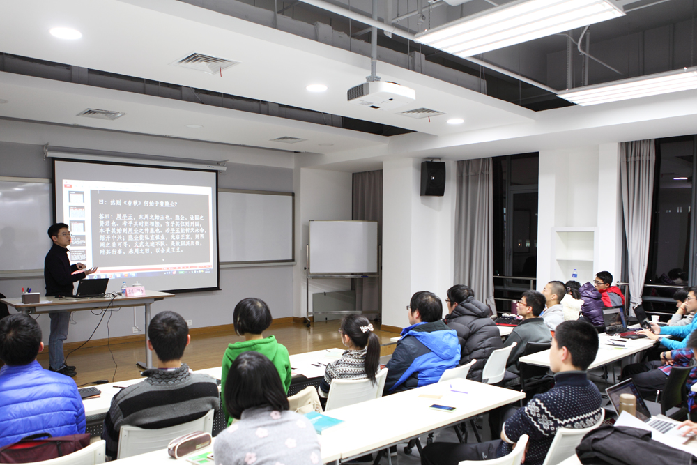 刘勋博士从前总理温家宝在最后一次记者招待会上说的“知我罪我,其惟春秋”切入,为同学们简明扼要地介绍了《春秋》、《左传》的成书背景,带领同学们一起解剖了“《春秋》为什么从鲁隐公元年开始”、“中华人民共和国的‘共和’原本是什么意思”这两个先秦古史的重大课题。作为一个“生科男”,刘博士以理工科式的严密逻辑提出假说、分析材料、对照比较,在解剖“周平王东迁在哪一年”这一历史悬案时甚至接连提出了5种假说,让同学们充分领略到历史研究的思辨性和复杂性。在讲座中,同学们看到了宋代四川地区雕印的《孟子》珍本书影,阅读了西安碑林中唐开成石经的《春秋》原文,还一窥了近年来才与学界见面的清华大学藏战国竹简的真容。