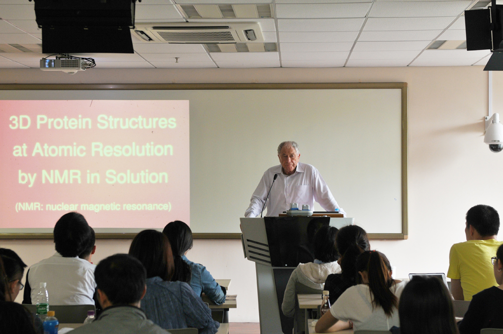 2015年4月26日下午,我校iHuman研究所特聘教授、2002年诺贝尔化学奖得主Kurt Wüthrich作为研究生选修课“结构生物学”的主讲教授之一,为研究生讲授了生物大分子三维结构测定主要方法之一——核磁共振波谱学(NMR)的基本原理及其在生物学中的应用。结构生物学为揭示生物大分子相互作用、信号跨膜转导、酶催化反应机理、突变导致疾病的分子机制、药物分子与靶点的抑制和激活关系等提供重要研究方法和技术手段,在生命科学基础研究、药物设计、合成生物学、转化医学等领域发挥着越来越大的作用。为了使研究生们牢固掌握该学科的基础知识和最新发展趋势,负责该课程的刘志杰教授邀请了多位校内和国内外知名学者参与讲授该门课程,Wüthrich教授欣然同意讲授该课程的核磁共振波谱学部分。