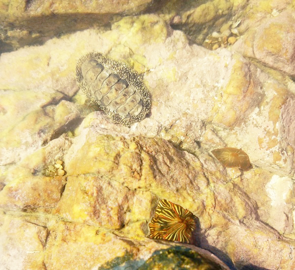 就在下午,同学们到达了第一处科考地点——洞头鸽尾礁。同学们万分珍惜这个机会,分为三个小队,在潮间带不同区域采集样本,观察软体动物分布情况。有时为了采集到一个特殊样品,手脚并用,互相协作,到达看似无法企及的区域。为此,有的同学手磨破了,脚磕着了,汗湿透了,衣服扯掉了,脸上手臂上挂上了伤口。甚至是离开后,当同学们回忆起这样一段道路,也还会心跳加快。