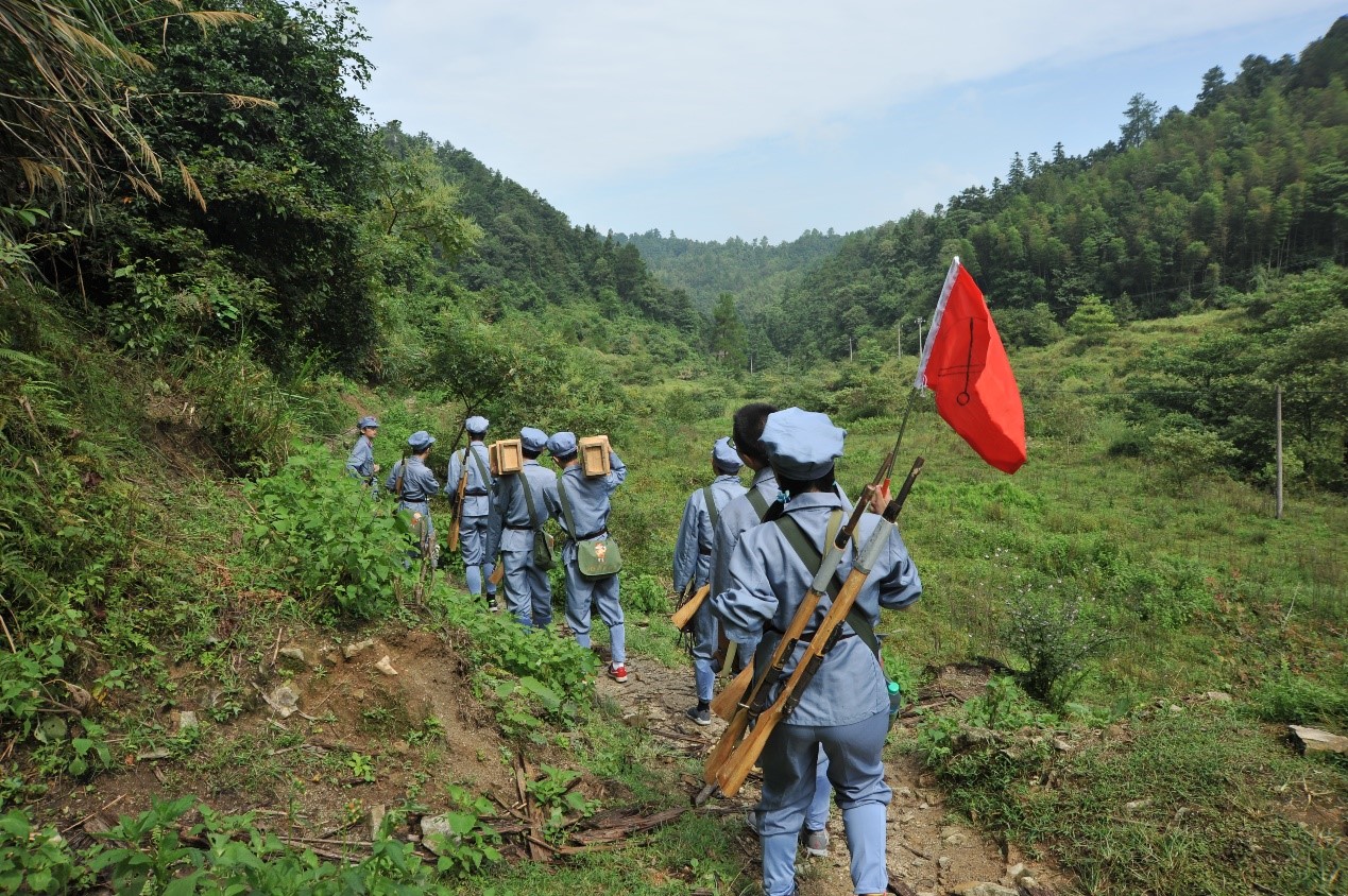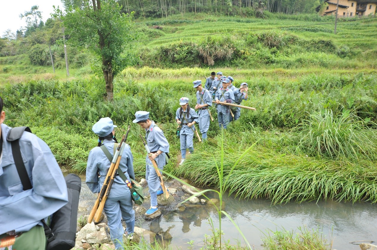 天公美意,连日的阴雨今日遁形,在急行军开始之前放了晴。穿上红军服,扛上红军枪,背上弹药箱,一行人揣着激动期待的心情踏上了红军当年走过的小路。行军途中还有任务——找到7个地标(需5个人与路标合影)及5种中草药,一连人分成两个班进行比赛。前几日的阴雨让小路变得泥泞难行,我们一度怀疑这条路是不是荒废已久,但路上不时出现的牛粪却在告诉我们:这是村民放牧时的常经之路。我们一边赶路,一边注意路边的地标,还要辨识中草药并且拍照记录。虽事先分工明确,却仍然出了不少岔子。走在前面的同学只顾辨别方向且急着赶路,经常忽略了地标,后面的同学发现后只得把前面的人叫回来拍照,减缓了行军的速度。草药在我们的眼中也大同小异难以辨识,负责甄别草药的同学也不得不放慢脚步走在队伍后面。每班12个人的队伍拖得长长的,两个班的同学甚至经常混在一起,“敌我不分”。不过,最终我们还是顺利到达了终点,并完成了现场制作担架、抬“伤员”的任务。二班同学还正确找到了6个地标,并且第一个到达目的地,小胜一筹。虽然满脚泥巴,一身臭汗,同学们脸上的笑意却是真真切切。整个过程虽困难重重,却也欢声笑语不断,遇到麻烦齐上阵,互帮互助团结一致,短短的七里路,彰显的是我们上科大学子的合作、探索精神。沿途风景也值得一提,流水潺潺,牛羊悠闲,鸡犬相闻,蝴蝶翩翩,正是一派农家好风光。