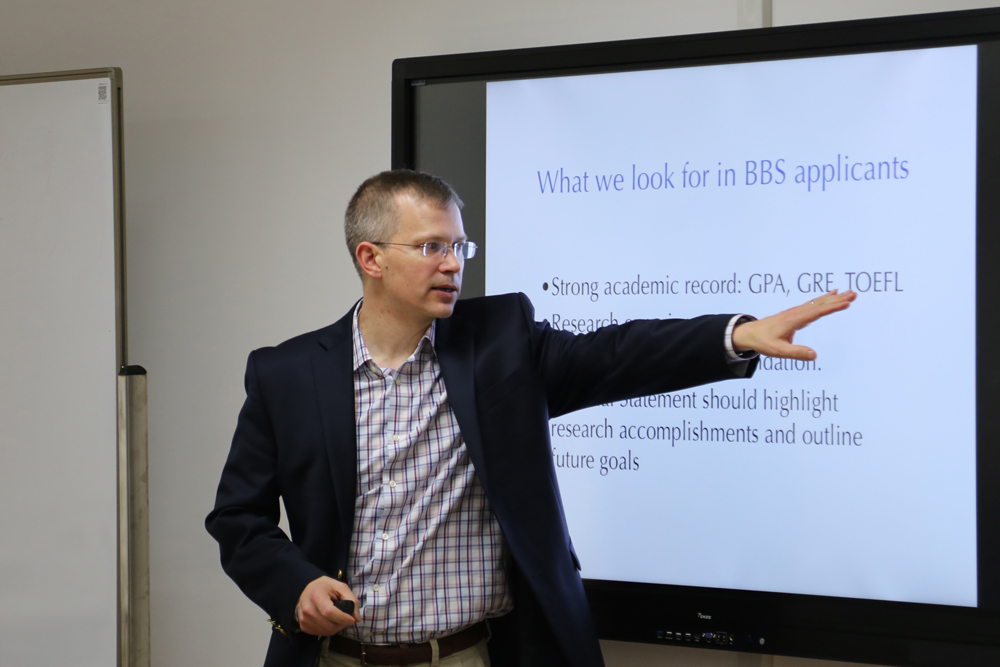 Anthony Koleske是美国耶鲁大学分子生物物理和生物化学以及神经生物学教授,同时也是Yale BBS Program负责人。报告中,Koleske教授从为什么要读博士、读博士需要具备哪些素质出发,向与会同学介绍了Yale BBS这个整合了耶鲁大学几乎所有生命科学领域研究内容的博士项目。