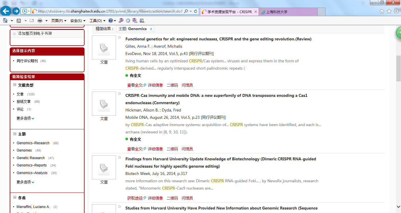 集成发现系统可检索学校订购或共享的各类文献数据库、图书馆馆藏图书、以及重要开放获取论文库,包括期刊与会议论文、学位论文、电子图书、纸本书刊、专利、标准等,并可直接查看全文或为您指引全文获取途径。系统基本功能如下: