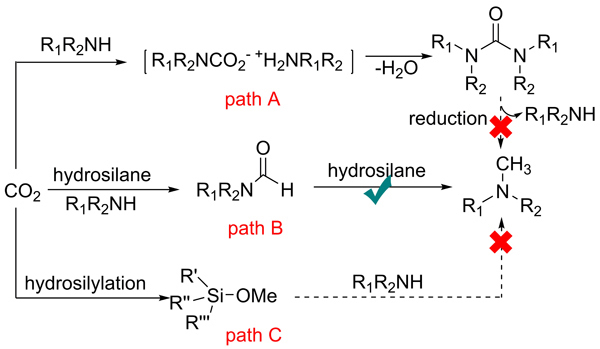 课题组研究人员发现,以碱金属碳酸盐作为催化剂,可以高效地调控反应的选择性,生成胺的甲酰化或甲基化产物。二氧化碳为甲酰和甲基两个官能团提供了C1的来源。与之前报导的催化体系相比,这篇论文中报导的碱金属碳酸盐体系不含过渡金属且简单廉价易得,具有更广的底物普适性,能够高效地应用到药物分子的甲基化反应中,是提高药物分子活性的一种途径。本工作还通过实验验证和密度泛函模拟相结合的方法对反应机理做了深入的研究。