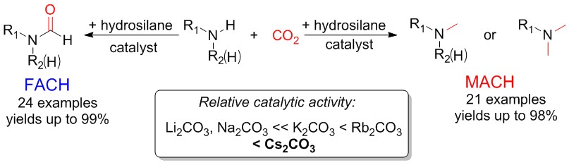 近日,我校物质学院林柏霖助理教授课题组在催化领域权威杂志《ACS Catalysis》在线发表了题为“Selective Formylation and Methylation of Amines Using Carbon Dioxide and Hydrosilane Catalyzed by Alkaline Metal Carbonates”的科研论文。该工作报导了一种新型催化体系,在温和的反应条件下能够高效地催化二氧化碳参与的胺甲基化和甲酰化反应,为二氧化碳的资源化利用提供了新的方法。二氧化碳是地球上最丰富的可再生碳资源之一,开发以二氧化碳为C1来源的化学合成方法对国民经济的可持续发展具有重要的意义。