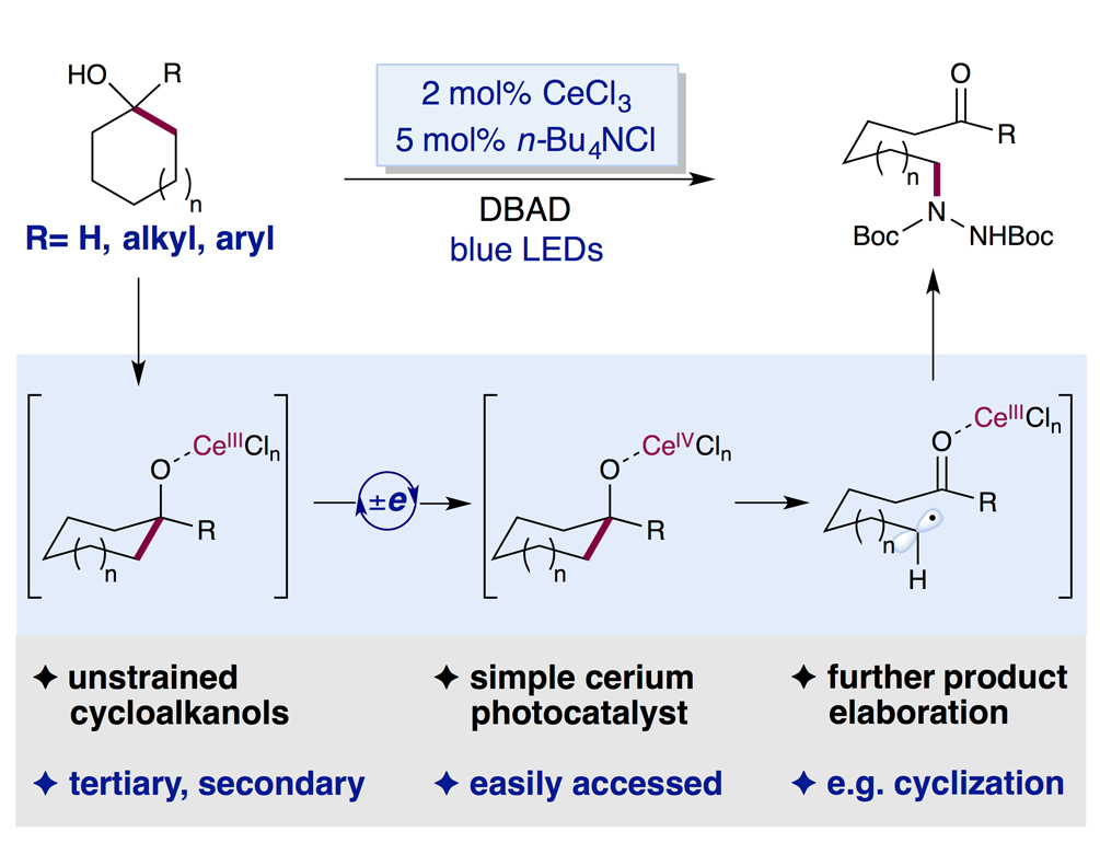 近日,我校物质学院左智伟助理教授课题组在国际知名学术期刊《Angewandte Chemie International Edition》在线发表了题为“Photocatalytic C−C Bond Cleavage and Amination of Cycloalkanols by Cerium(III) Chloride Complex”的研究论文,报道了该组在可见光催化碳碳键活化研究方面取得的新进展。左智伟组博士后郭靖婧、胡安华为共同第一作者,左智伟为通讯作者。