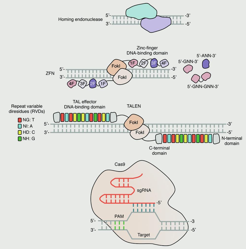 这篇综述总结并比较了目前基因编辑常用的四种分子工具:归巢核酸内切酶(homing endonuclease)、锌指蛋白核酸酶(zinc finger nuclease, ZFN)、TALEN以及CRISPR/Cas9。这些核酸酶可被人工改造,用于识别并切割基因组中的特定序列,造成双链DNA的断裂,以实现基因的移码敲除、缺失、外源基因插入、单个核苷酸替换等。除了介绍这四种“分子剪刀”的基本原理外,此篇文章还总结归纳了它们的一系列应用,如细胞系构建、模式动物构建、药物靶点筛选、疾病治疗等,并对未来研究方向进行了展望。
