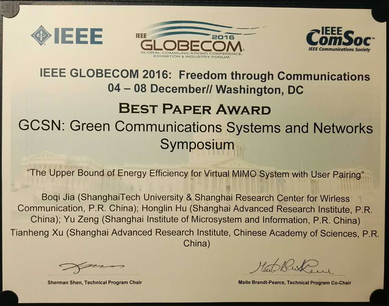 2016年12月4日到12月8日,在美国华盛顿召开的IEEE 2016全球通信大会(IEEE GLOBECOM 2016)上,我校信息学院博士研究生贾波琦(导师:信息学院特聘教授、中科院上海高等研究院研究员胡宏林)以第一作者身份凭借一篇题为“The Upper Bound of Energy Efficiency for Virtual MIMO System with User Pairing”的论文获得了大会颁发的最佳论文奖(Best Paper Award)。