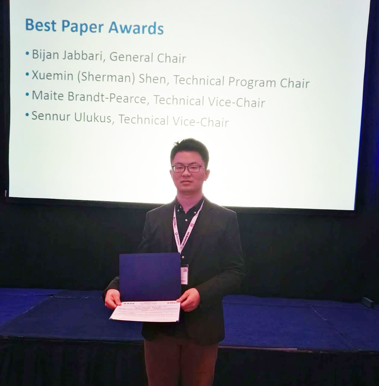 IEEE GLOBECOM是世界通信行业的两大旗舰会议之一,于每年十二月中旬定期召开,涵盖了信息论、认知无线电技术、网络安全、无线通信网络、光通信网络、大数据、云计算、绿色通信、物联网等在内的通信行业各个领域。本次大会从2500多篇投稿中进行评选,共评选出16篇最佳论文,贾同学的论文获得了绿色通信与网络领域唯一的最佳论文奖。
