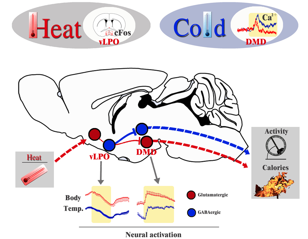 通过cFos(神经激活标记物)染色发现,热(38摄氏度)会激活下丘脑视前区的亚区(ventral part of lateral Preoptic nucleus,vLPO)的谷氨酸能(兴奋型)和γ-氨基丁酸能(抑制型)神经元。用光遗传学(optogenetics)手段激活这些神经元,则会触发强烈的体温下降和活动度降低;而抑制这些神经元则会迅速升高体温,达到高烧水平(40.7摄氏度)。因此,vLPO神经元负责了热驱动的降温行为。