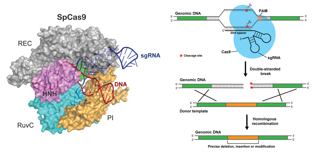 Cas9蛋白晶体结构(左)和使用CRISPR/Cas9系统对基因组进行编辑的示意图(右)
