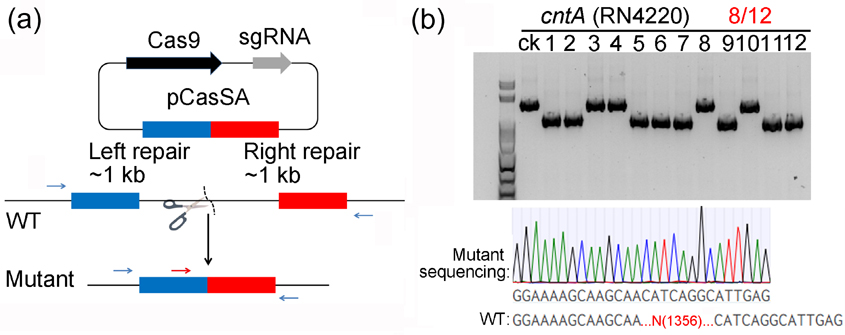 基于CRISPR/Cas9系统的金黄色葡萄球菌基因组编辑方法。(a)基因组编辑过程示意图。(b)利用pCasSA系统在金黄色葡萄球菌RN4220菌株中对cntA基因进行敲除。