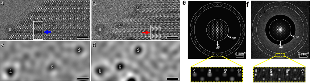 手性分子筛沿(a)[2-1-10]和(b)[1-100]的高分辨透射电子显微图像,(c)和(d)对应(a)和(b)的傅里叶过滤图像。 手性分子筛沿[0001]的(e)模拟和(f)实验旋进电子衍射花样。