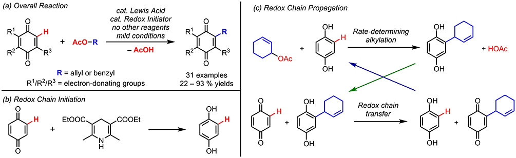 有意思的是,该方法的机理并不多见于文献之中。醌类化合物和烯丙基酯、苄基酯都是良好的亲电试剂,二者之间的偶联反应并不符合一般有机反应亲电试剂与亲核试剂结合的规律。研究者们经过反复推敲和验证,提出该反应是通过氧化还原链式反应机理实现的(如图)。课题组利用动力学实验、对照实验等方式初步验证了该机理,并发现催化量的Hantzsch ester试剂可作为通用的链式反应引发剂,在广泛的醌类、酯类原料之间的反应中可以取得良好的引发效果。
