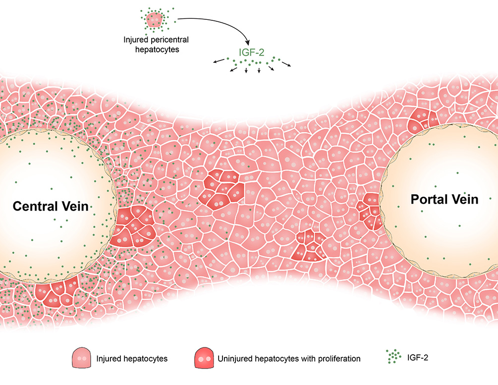 慢性肝损伤后肝脏再生过程,中央静脉区受损伤的肝实质细胞通过分泌IGF-2促进未受损伤的肝实质细胞增殖