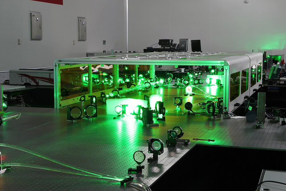钛宝石主放大器输出的纳秒级啁啾脉冲最高能量达到339焦耳,激光脉冲宽度经过脉冲压缩器压缩后达到21飞秒,压缩器效率64%,压缩后激光脉冲的最高峰值功率可达10.3拍瓦,这是目前已知的最高激光脉冲峰值功率。