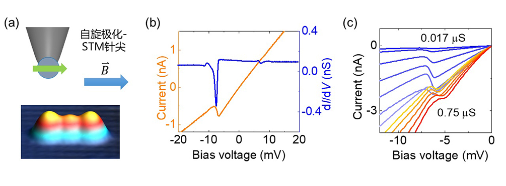 (A)工作原理示意图;(B)自旋极化隧穿电流-电压曲线和微分电导谱;