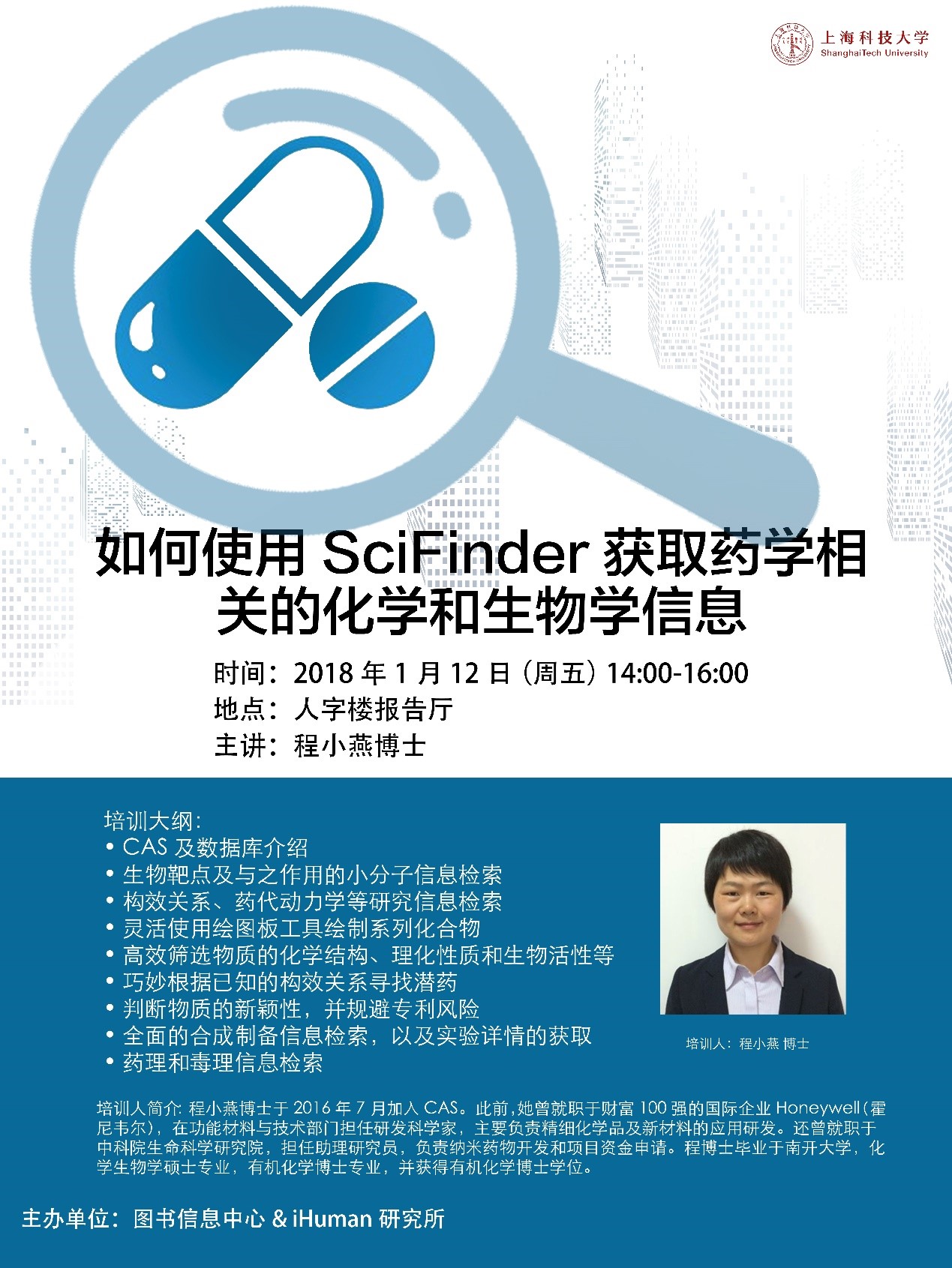 时间:2018年1月12日 (周五) 14:00 -16:00地点:人字楼报告厅主讲:程小燕博士,美国化学文摘社(CAS)北京代表处产品与内容培训应用专员
