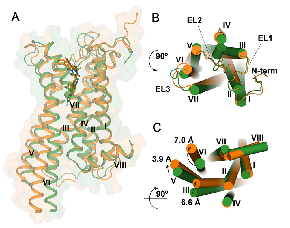 A:两种不同状态的五羟色胺2C受体三维结构图,橙色为激活状态,绿色为抑制状态。