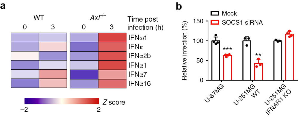 刘佳及合作者研究了寨卡病毒感染人类星型胶质细胞的过程,发现AXL的靶向基因敲除能使寨卡病毒感染星型胶质细胞的能力降低,但并不能防止病毒进入细胞,说明AXL并非寨卡病毒受体而是通过其他方式促进病毒感染。研究团队进一步阐明,AXL是通过拮抗I类干扰素信号通路来促进感染的。同时,本篇文章还证明了SOCS1蛋白质在AXL调控I类干扰素的过程中,起到了重要作用。