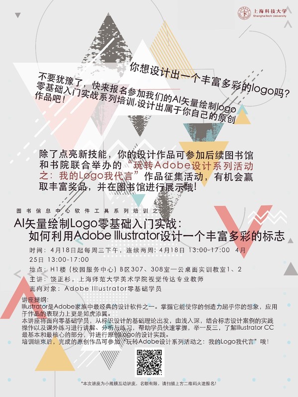 除了点亮新技能,你的设计作品可参加后续图书馆和书院联合举办的“玩转Adobe设计系列活动之:我的Logo我代言”作品征集活动,有机会赢取丰富奖品,并在图书馆进行展示哦!