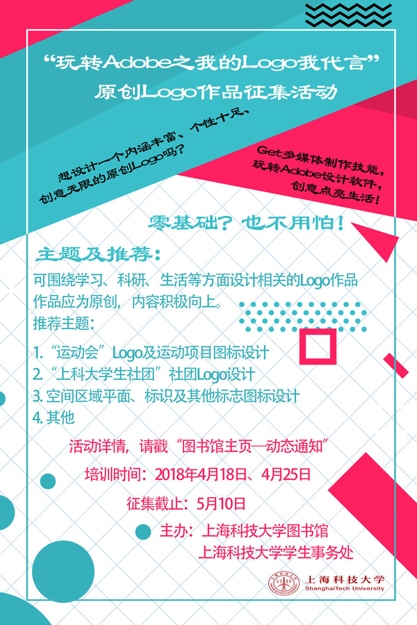 培训及技术指导时间:2018年4月18日、4月25日(详见:图书馆-AI矢量绘制Logo零基础入门实战培训)