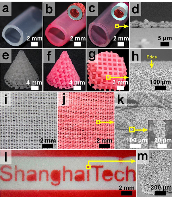 该研究首先利用透射电子显微镜和原子力显微镜研究了一种模型MOF材料,ZIF-8在CNFs涂层上的结晶动力学,发现ZIF-8晶粒在生长初期确实沿着纳米纤维网络生长,这验证了CNFs能够作为有效的MOFs结晶中心促进晶体生长的可行性。其后,研究人员选择了12种亲疏水性不同的高分子基板对比研究了CNFs对ZIF-8结晶生长的帮助,发现有CNFs涂层的高分子基板MOF覆盖率相比未处理的高分子基板均得到了显著的提高。尤其是在疏水且化学惰性的聚偏氟乙烯基板上,ZIF-8的覆盖率提升达到了100倍。研究团队进一步将该方法拓展到塑料管、塑料纤维织物甚至具有复杂形状的三维模型物体上,均取得了非常好的MOFs生长效果。结合图案化可控生长的方法,李涛和钟超课题组成功地利用MOF制作出了具有“ShanghaiTech”字样的图案,证明了该方法的灵活多变性。