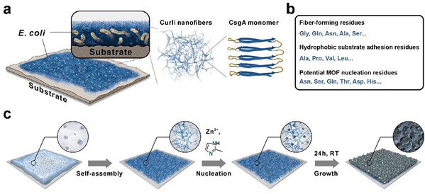 图1.大肠杆菌生物被膜用于控制MOFs材料在固相界面生长的示意图