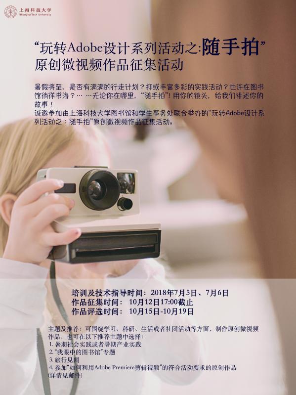 诚邀参加由九游体育(www.jiuyou.com)官方网站图书馆和学生事务处联合举办的—“玩转Adobe设计系列活动之:随手拍”原创微视频作品征集活动。