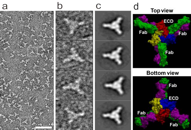 通过使用纳米磷脂盘(nanodisc)组装ASIC1a膜蛋白模拟该通道天然构象的手段,研究者们利用“差异化筛选”的方法从噬菌体展示库中筛选出了ASIC1a的数个抗体。在后续研究中,发现抗体ASC06对人源ASIC1a具有很强的亲和力(亲和力常数为7.9 nM),而不结合任何其他亚型的ASICs通道;在ASIC1a基因敲除小鼠神经元上染色的结果也验证了该抗体的特异性,使得ASC06成为目前报道的首个ASIC1a特异性抗体。扫描电子显微镜研究清晰显示:在每三个亚基组成的一个ASIC1a离子通道上,可以结合三个ASC06抗体;进一步的分子动力学模拟显示了复合物的结构(见图1)。