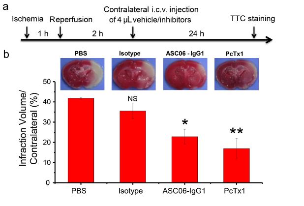 功能研究发现,经全长化改造的ASC06抗体(ASC06-IgG1)不仅可以长期(长达30分钟)有效地抑制酸诱导的ASIC1a通道电流,还能强效阻断酸诱导的、ASIC1a介导的钙离子内流(IC50=2.8 nM)现象;经ASIC1a通道的钙离子内流及其引发的下游信号变化,被认为中风发生时ASIC1a引起神经元死亡的主要机制之一。随后的细胞与动物水平的实验进一步揭示了该抗体在酸中毒环境中的细胞及神经保护作用。ASIC1a作为治疗中风的靶点具有治疗窗口长的显著优势;研究还发现在缺血3小时后注射ASC06-IgG1抗体,可有效降低中风模型小鼠的脑梗死区域体积,显现出良好的临床应用前景(见图2)。初步机制研究表明,该抗体与毒素肽PcTx1不同,以非质子竞争性的方式起拮抗作用。