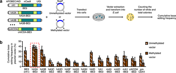 b:hA3A-BE3能够在高甲基化区域进行高效碱基编辑