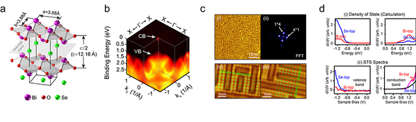 物质学院联合团队利用同步辐射光源角分辨光电子能谱、隧道扫描显微镜及第一性原理计算等方法对Bi2O2Se电子结构开展研究。得到了其完整的电子结构,获取了有效质量、费米速度及带隙大小等对器件应用的关键物理参数(图1b);实验研究发现虽然样品解理表面具有50%的Se缺陷(图1c),但是其能带带隙依然保持不变和稳定。该稳定性可以用第一性原理计算加以解释(图1d)。这项工作深入解析了此种新型半导体材料电子结构,并为其进一步的开发应用打下了坚实的基础。