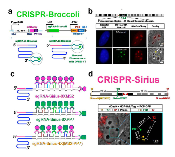 c.CRISPR-Sirius系统示意图;d.利用CRISPR-Sirius活细胞跟踪染色体高级结构。