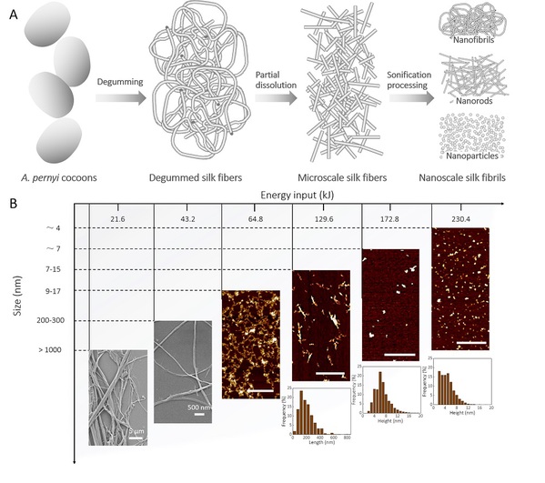 动物丝具有规整的介观结构,如微纤、纳纤及纳米颗粒。这些介观结构对丝的力学性能和生物功能都起到重要作用,但提取和利用这些丝介观结构单元则具有一定挑战性,其原因在于丝纤维复杂结构组织及较高的结晶度。凌盛杰课题组在前期工作的基础上[Adv. Mater., 2014, 26, 4569; Adv. Mater., 2016, 28, 7783; US patent, WO 2017/192227 Al; Sci. Adv., 2017, 3, e1601939; US patent, WO 2018/081159Al],与国家蛋白质设施上海光源01B线站、合肥同步辐射国家实验室红外线站及美国塔夫茨大学的研究人员合作,通过一种“预氧化部分溶解和物理分散”方式,成功实现了对丝介观结构单元的全剥离,制备了尺度均匀、形貌可控、高力学模量的微纤、纳纤和纳米颗粒水性分散液,具有良好的再分散性及可加工性。在此基础上,研究人员还积极探索将这些丝介观结构应用于电子和环境领域,如污水处理、有机溶剂回收,纸传感器,纳米农药/肥料等。这些探索性研究为动物丝蛋白基纳米材料应用提供了新的思考方向。