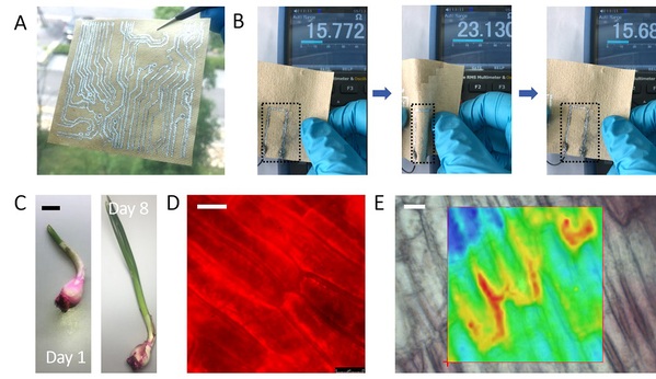 图A,B印有电路的丝纸传感器在弯折过程中的电阻变化。图C-E,柞蚕丝纳米颗粒负载罗丹明纳米肥料可很好地被水仙细胞吸收。