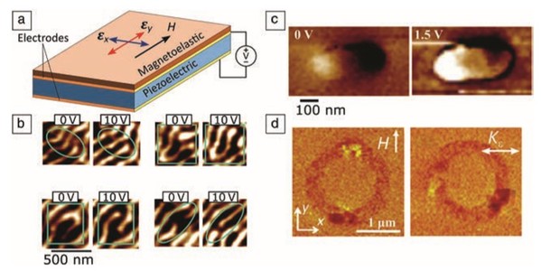 图1.通过施加电压对磁性薄膜、微纳尺度椭圆和圆环结构的磁畴控制