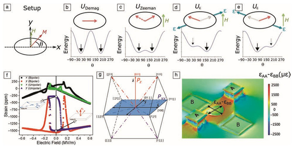 图2. (a-e)薄膜椭圆中多种能量的影响(f-g)利用特定切向的PMN-PT实现的磁畴控制(h)利用两组电极实现双轴应力