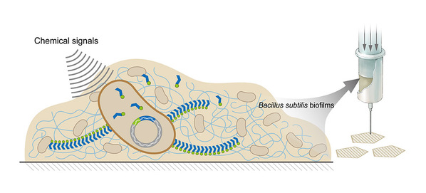 图1.可编程可打印的枯草芽孢杆菌生物被膜活体材料示意图。