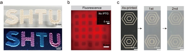 钟超课题组进一步发现,利用基因工程不仅能改变枯草芽孢杆菌生物被膜的成份及生化功能,还能进一步调节生物被膜本身的机械性能(比如粘弹性)和物化性质(比如亲疏水性)。被改造后的生物被膜展现出更适宜生物制造的凝胶胶体性质,可以通过3D打印精确地制成不同的三维形状。实验证明,这些活体材料不仅本身可以直接3D打印,还可以与量子点混合打印,打印成型的活体材料在水凝胶中能感应溶液中的外界信号发出荧光,可以用作生物传感器。生物被膜展现出来的这些机械性质,对于未来不同用途的生物制造以及更安全包装活细菌材料来说更具价值。值得一提的是,作为活体材料,这些工程改造后的生物被膜即使被长期储存,仍具有自我再生的特性,并具有传代后仍保留原有物理和机械性质的特征。因此展现出传统材料不具有的“活体”特征。这项研究将为活体功能材料的应用拓宽思路。