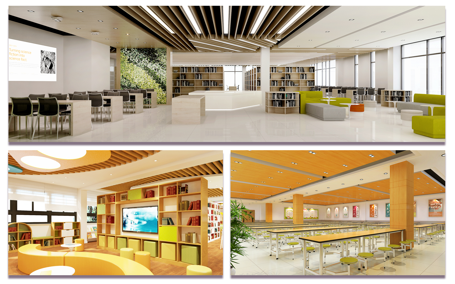 中小学图书馆采用集“藏、借、阅、研、休”功能为一体的大空间、全开架布局方式。同时,在学校走廊、教室设立书、报、刊流通点,形成“学校在图书馆中”的格局。图书馆是校园里最宁静、最平和,也最富有的地方,你尽可以拿上一本书,选个舒服的姿势和角落,让书香浸润心灵,让梦想从这里起航。