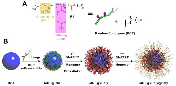 基于这个挑战,李涛课题组开发了一种基于无规共聚物(random copolymer,RCP)弱作用力自组装结合表面引发原子转移自由基聚合(SI-ATRP)的方法,成功在各种MOFs材料表面生长高分子。该方法首先设计了一种带有多个羧酸官能团和多个ATRP(溴代异丁酸酯)引发位点的RCP,进而利用聚合物分子链之间的氢键在MOF颗粒表面快速自组装并将ATRP引发位点引入到MOF表面。随后在单体(monomer)和交联单体(crosslinking monomer)的环境下进行SI-ATRP,便能在MOF表面牢固包覆一层厚度均匀且可调的共价交联高分子网络。得益于ATRP聚合可逆失活的特性,在完成第一层高分子的生长之后,还可以继续进行第二甚至第三层高分子的生长,由此实现MOFs表面高分子层组成、序列以及构型的任意调控。该方法的开发解决了MOFs表面修饰高分子这一长久以来的难题,并使MOF和高分子复合材料的精准合成以及界面调控成为可能。