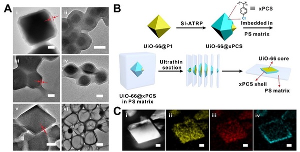 金属有机框架材料(MOFs)是一系列利用金属离子或金属簇(metal ions/clusters)和有机配体(organic linker)配位结晶形成的结构与化学组成极其丰富的纳米多孔材料。这类材料在气体储存、气体分离、催化和生物成像等不少领域具有潜在的应用前景。而可以用来制备MOFs的原料几乎包括了元素周期表上的所有金属及有机化学库中取之不尽的配体。在短短的20年中被报道的MOFs结构已超过20000种。在MOF颗粒外面修饰一层柔软的高分子构建具有MOF@polymer壳核结构的复合材料可以精确调控MOFs表面的一系列性质,并提升MOF在生物成像、医学治疗、气体膜分离和催化等应用领域的性能。然而正因为MOFs材料的多样性,在MOFs表面修饰高分子的方法通常仅局限于特定的MOFs体系。至今尚没有一种普适的方法能应用于各种MOFs。