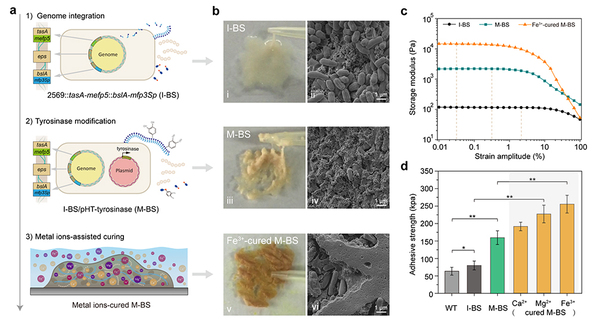 由此,钟超课题组基于合成生物学与材料科学的交叉学科思想,首次提出了基于枯草芽孢杆菌生物被膜来构建活体粘合胶水的新思路。细菌生物被膜通常由细菌及其胞外分泌物质(如蛋白质、多糖、DNA)组成。枯草芽孢杆菌的生物被膜基质中则主要含有淀粉样蛋白TasA、胞外多糖EPS以及表面疏水蛋白BslA等。结合自然界海洋生物的水下粘合特征,例如淀粉样蛋白结构(存在于藤壶粘性蛋白),多巴分子(存在于贻贝粘性足丝蛋白)以及金属离子促进的内在交联结构(存在于沙塔蠕虫中),研究人员采用基因工程的手段,构建了基于TasA和BslA的融合粘性蛋白TasA-Mefp5与BslA-Mfp3Sp,可分别提供内在粘性和界面粘性能力。为解决原核生物不能翻译后修饰的问题,研究人员通过引入表达质粒,让细菌表达酪氨酸酶来催化酪氨酸成为多巴分子。此外,研究人员还利用多糖分子的聚阴离子特性,加入Fe3+或其他金属离子溶液促成EPS-Fe3+的交联结构,从而进一步增加了生物被膜的内在粘性。