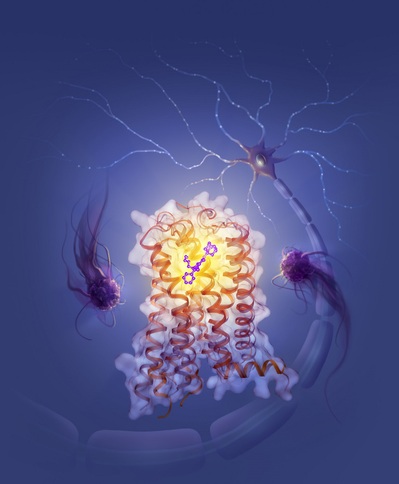 图注:与小分子AM10257结合的大麻素受体CB2和CB1,及其外周免疫细胞和神经细胞的艺术展现图,以展示其对神经和免疫系统的精准调控。