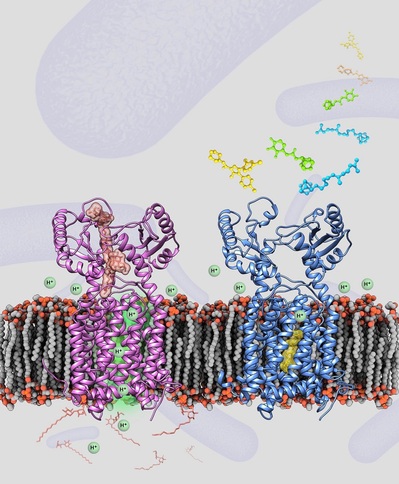 不同于其他细菌,作为一种分枝杆菌,结核杆菌的细胞表面有一层非常致密的细胞壁,而分枝菌酸就是这层细胞壁的主要成分之一。由于分枝菌酸的存在,结核杆菌不仅可以免受许多化学物质的侵蚀,还可以耐受很多常见的抗生素。不过,再可怕的敌人也有致命弱点,结核杆菌也不例外。结核杆菌赖以生存的分枝菌酸,其合成与运输的过程恰恰就是它的致命弱点。最近,科学家们发现分枝杆菌中有一种被称为“MmpL3”的膜蛋白在分枝菌酸的制造过程中起了关键作用。它负责把细菌在细胞内合成的分枝菌酸前体转运到细胞膜外,这些前体物质会被进一步加工合成为分枝菌酸。因此,MmpL3蛋白在分枝菌酸合成通路中起到了一台“传送机”的作用。这台“传送机”的动力来源于膜外侧的质子向膜内侧流动形成的质子流。这股质子流就像水流发电一样,给这台“传送机”提供了源源不断的动力。鉴于MmpL3对分枝杆菌至关重要的地位,它已成为抗结核新药研发的一个关键靶标。目前,有报道称国际制药公司利用高通量技术筛选获得的抗结核新药SQ109(已完成临床II-III期试验)可能靶向MmpL3。但是,这台“传送机”的构造仍然是一个谜,科学家们对临床抗结核药物SQ109如何靶向MmpL3的分子机制更是一无所知。这些都成为了抗结核新药研发中的国际难题。