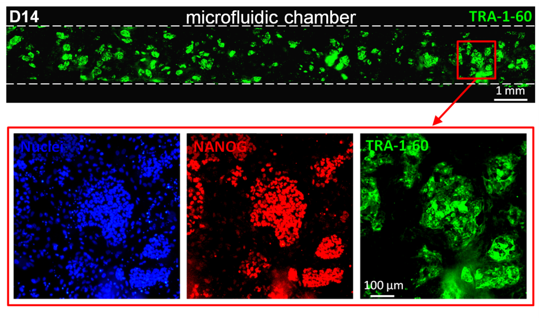 图注:人成纤维细胞在微流体重编程14天后,hiPSC集落多能性标志物的表达