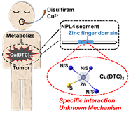 基于发现的综合模型反应和已有文献信息,林柏霖团队提出了双硫仑广谱定向治疗癌症的首个可能的分子级别机制。首先,肿瘤组织会选择性富集铜离子,这个已经有相当多的文献证据。其次,双硫仑会通过常规体内代谢生成DTC,在内循环中碰到肿瘤组织后,与富集的铜离子在生成强螯合共价配位键的驱动下,原位产生强疏水性的Cu(DTC)2小分子配位化合物。这一组合使铜离子不仅避免了被调控蛋白捕获命运,还拥有了直接穿透细胞膜进入细胞内的能力。之后,在癌细胞内远高于正常细胞的酸性环境下,Cu(DTC)2因其特殊的氧化选择性,克服了细胞内还原性保护屏障,进而通过氧化细胞内包括与被泛素化蛋白隔离有关的NPL4等蛋白在内的锌指区域的锌硫位点,诱导蛋白变性。因此,包括p97-UFD1-NPL4降解癌细胞快速增殖产生残次蛋白在内的通路会被抑制,进而癌细胞被选择性杀死。